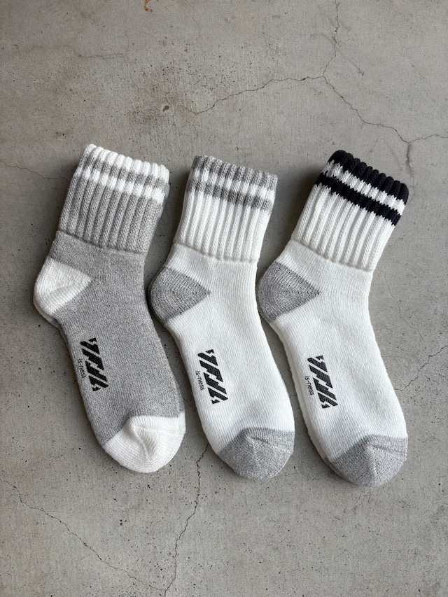 BRAND : is-ness MODEL : is-ness x VIBSOX COLOR : WHITE x GRAY/ WHITE x NAVY/ GRAY x WHITE SIZE : ONE PRICE : ¥2,800+Tax 素材 : 90% COTTON, 6% POLYESTER, 3% NYLON, 1% POLYURETHANE 原産国 : 日本製 サイズ : size : ONE / 25-28cm VIBTEXの確かな機能性とis-nessのデザインが融合した ニュースタンダードソックス。 抗菌素材を使用。 リブを二重仕立てにすることで、圧迫感が無く、 締め付けが少ないストレスフリー。 裏側はガーゼ素材を使用し肌に優しく、 つま先/足底/かかとはタオル生地(パイル仕様)で クッション性がありエアリーな履き心地。 VIBSOX(ビブソックス): VIBTEX(ビブテックス)テクノロジーを採用し、 足元を清潔に保つMADE IN NARAの新開発ソックスブランド。 1、汗や加齢臭に対して約30分で「99%消臭」。 2、VIBTEX技術による抗菌防臭機能搭載 3、洗濯しても機能持続 ※店頭には袋から出して展示している為 袋は付属しない事が多いので 何卒ご了承くださいませ。