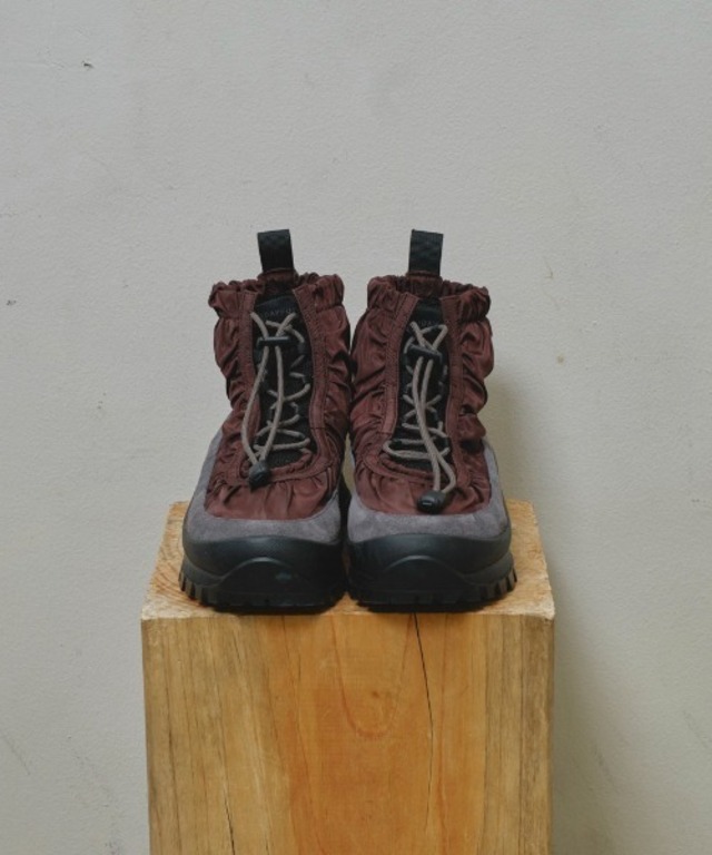 NANGA × FlowerMOUNTAIN FlowerMOUNTAINが積み重ねてきた アーバンとアウトドアが融合した世界観を ストレートに表現したコラボレーションモデル。 スニーカーの印象を特徴づけるサイドのデザインは NANGAのコンセプトである山、 ナンガパルバットの稜線を模したデザインラインを採用。 踵部には”NANGA”の刻印が施され、 アイレットステイとシュータンには ヌメ革のFlower MOUNTAINのモチーフを配し、 両ブランドのアイコニックなDNAが 1足の中に凝縮されたデザインとなっている。 アウトソールは高いグリップ性能を発揮する ビブラム社の『 MEGA GRIP 』を使用した オリジナルソールを搭載、 シューズ内部には透湿防水膜素材を使用し 優れた防水機能を持つ構造になっている。 本格的なアウトドアシーンにも対応可能な ハイスペックな1足に仕上げられている。 _____________________ 素材 カウレザー+ピックレザー+ナイロン アウトソール EVA+ラバー(ビムラム社"MEGAGRIP"ソール) 防水機能 透湿防水膜素材"Hydro Guard" カラー Wolf gray、