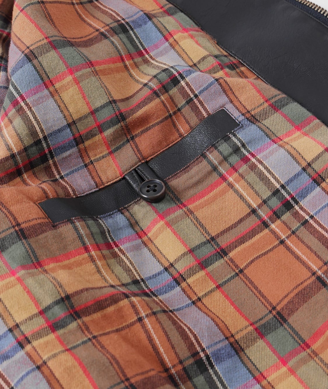 過去にも何度か作っていたフェイクレザーのジャケット。リアルレザーよりも軽くて扱いやすいところがいいところ。今回は色落ちするフェイクレザーの生地を見つけて加工感のあるブルゾンタイプを作った。最初から部分的に色落ちしているが、着込むたびにより雰囲気が出てくる仕掛けになっているのでぜひ着込んで自分だけの1着に仕上げてほしい。裏地のチェックもよい雰囲気です。濡れると他の服に色移りするかもしれないのでその点はご注意を。