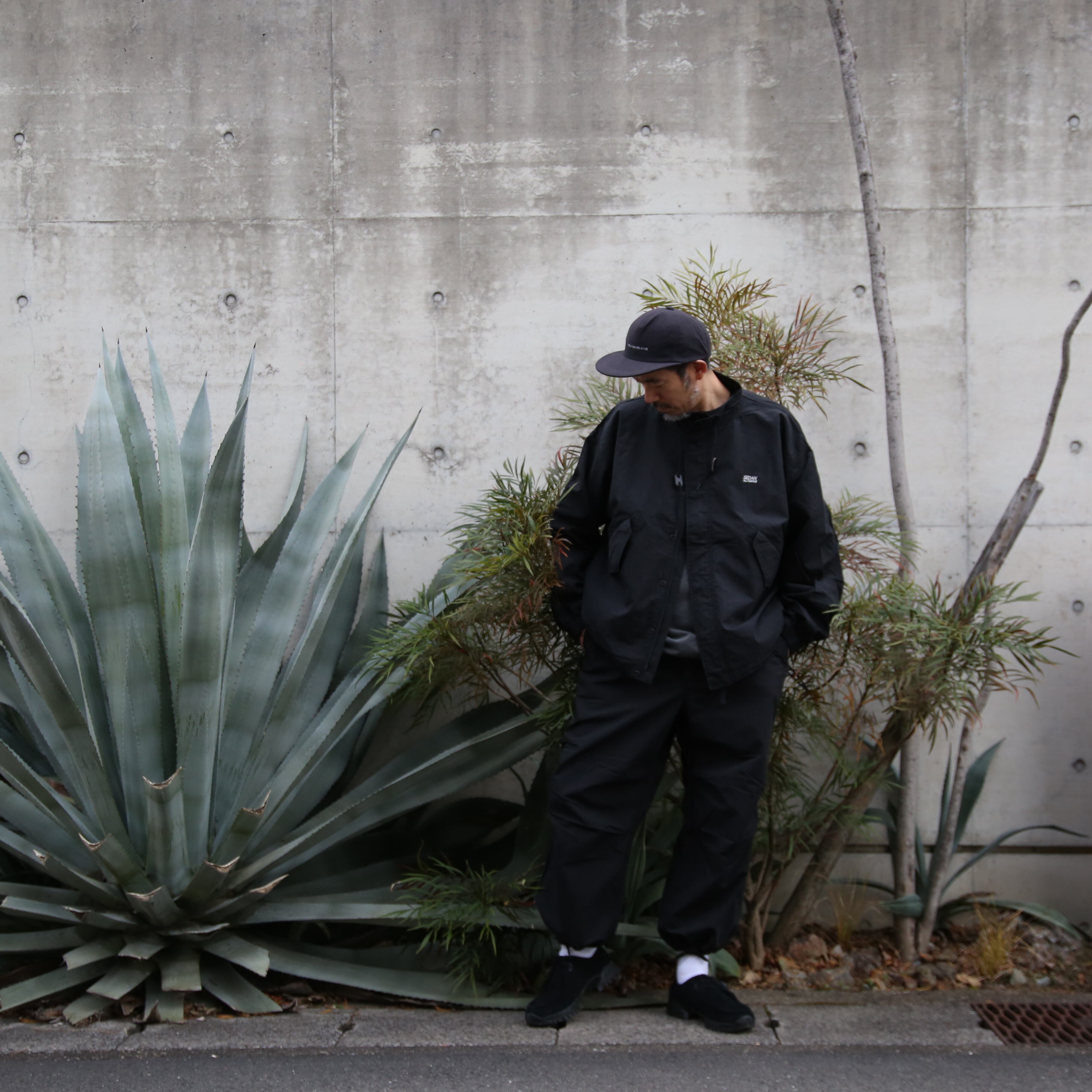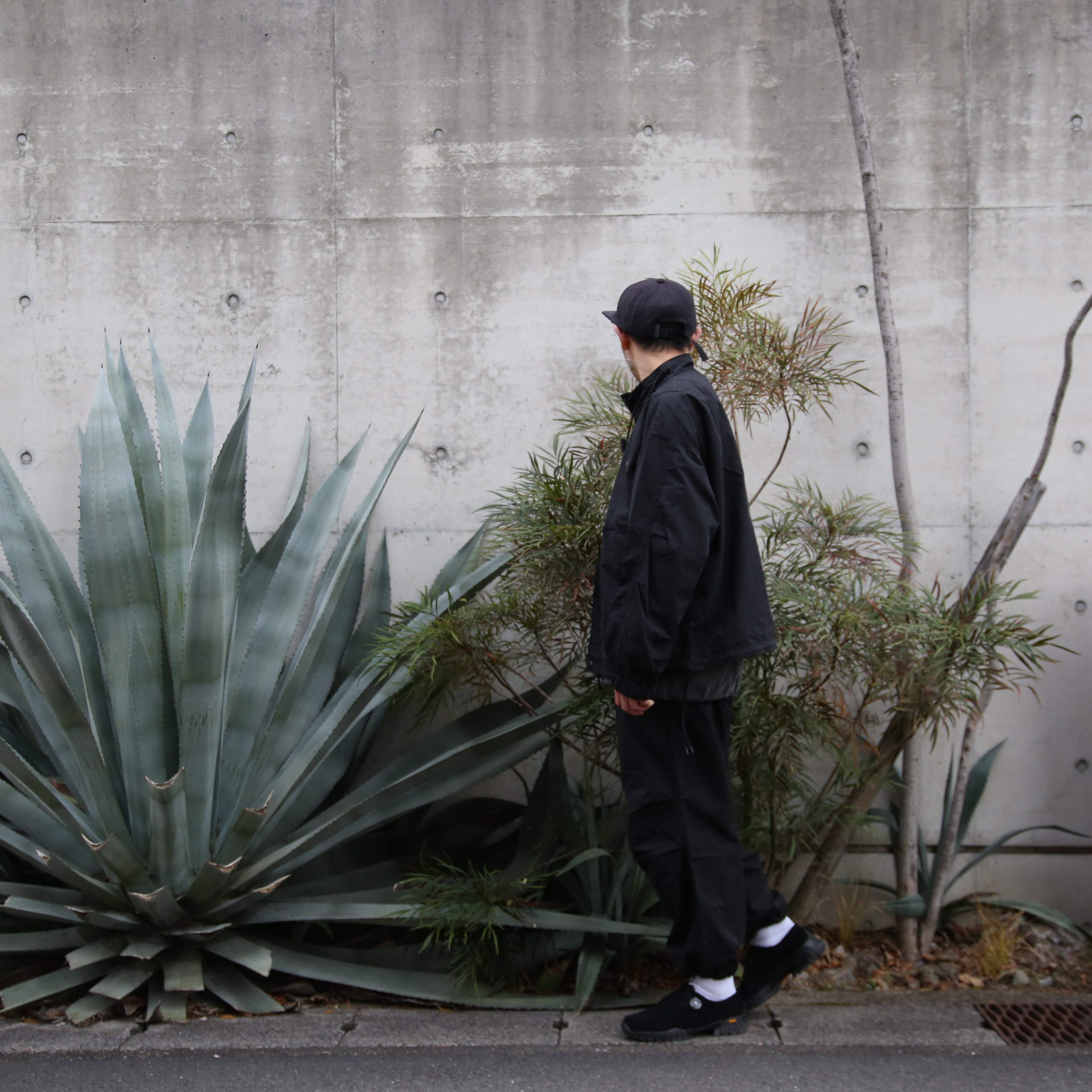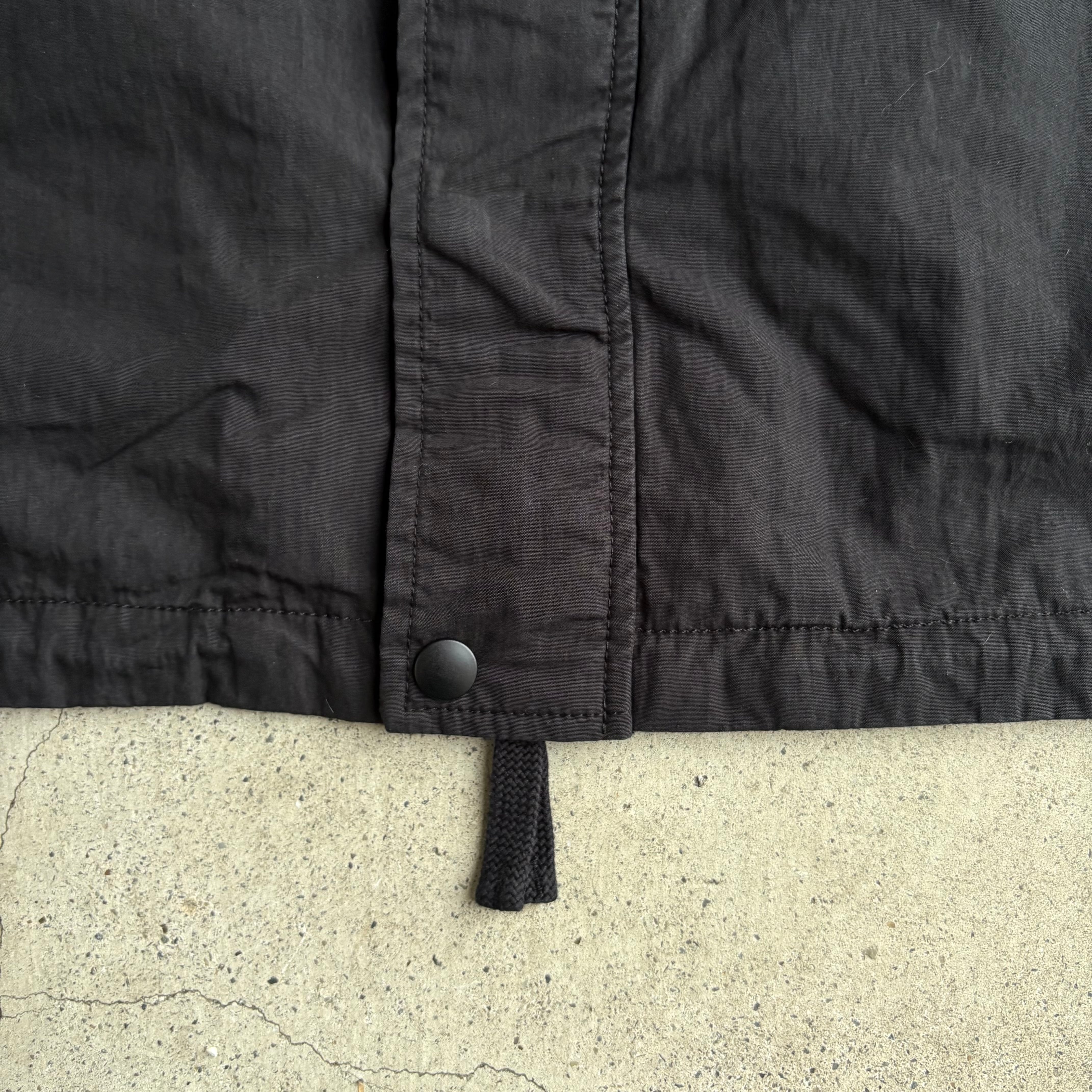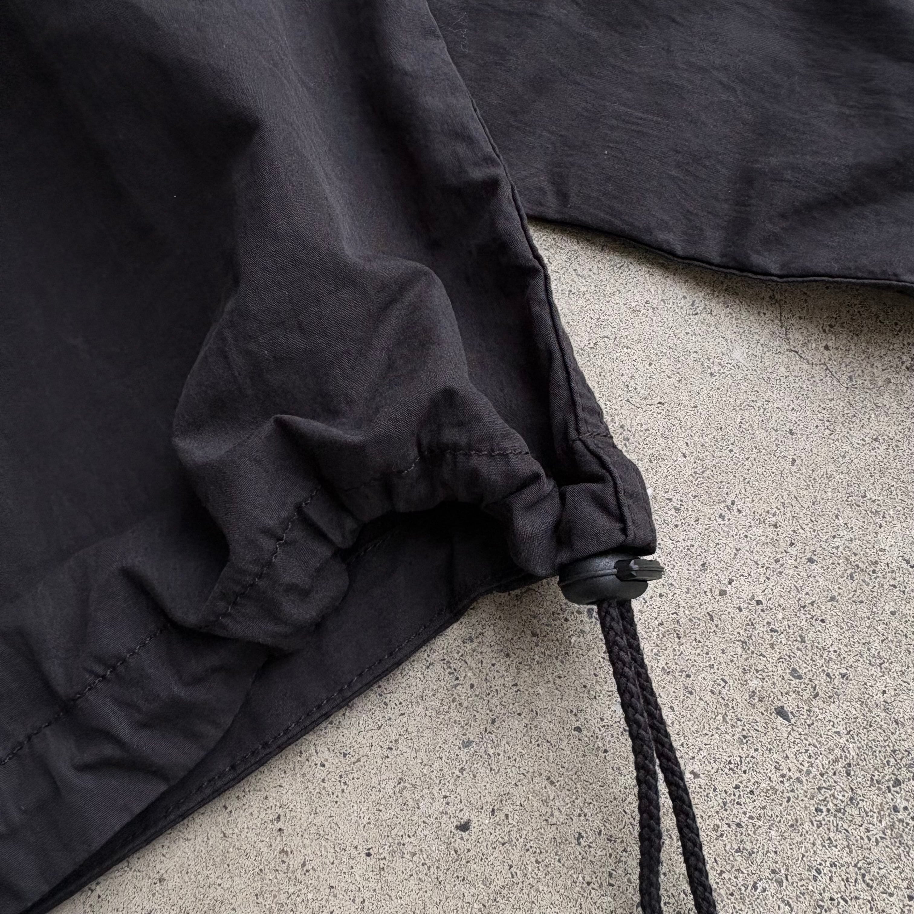 素材はコットンxナイロンを使用しており、製品洗い加工済みで味わいがありつつ使い勝手の良い素材なので、まだ試したことのない方にはおすすめの素材となっています。広い身幅と太い袖を有しており、フーディーの上に羽織れば冬から春にかけての肌寒い季節にも対応可能。裾や襟のドローコードはぎゅっと絞って着るとまた違った印象に。