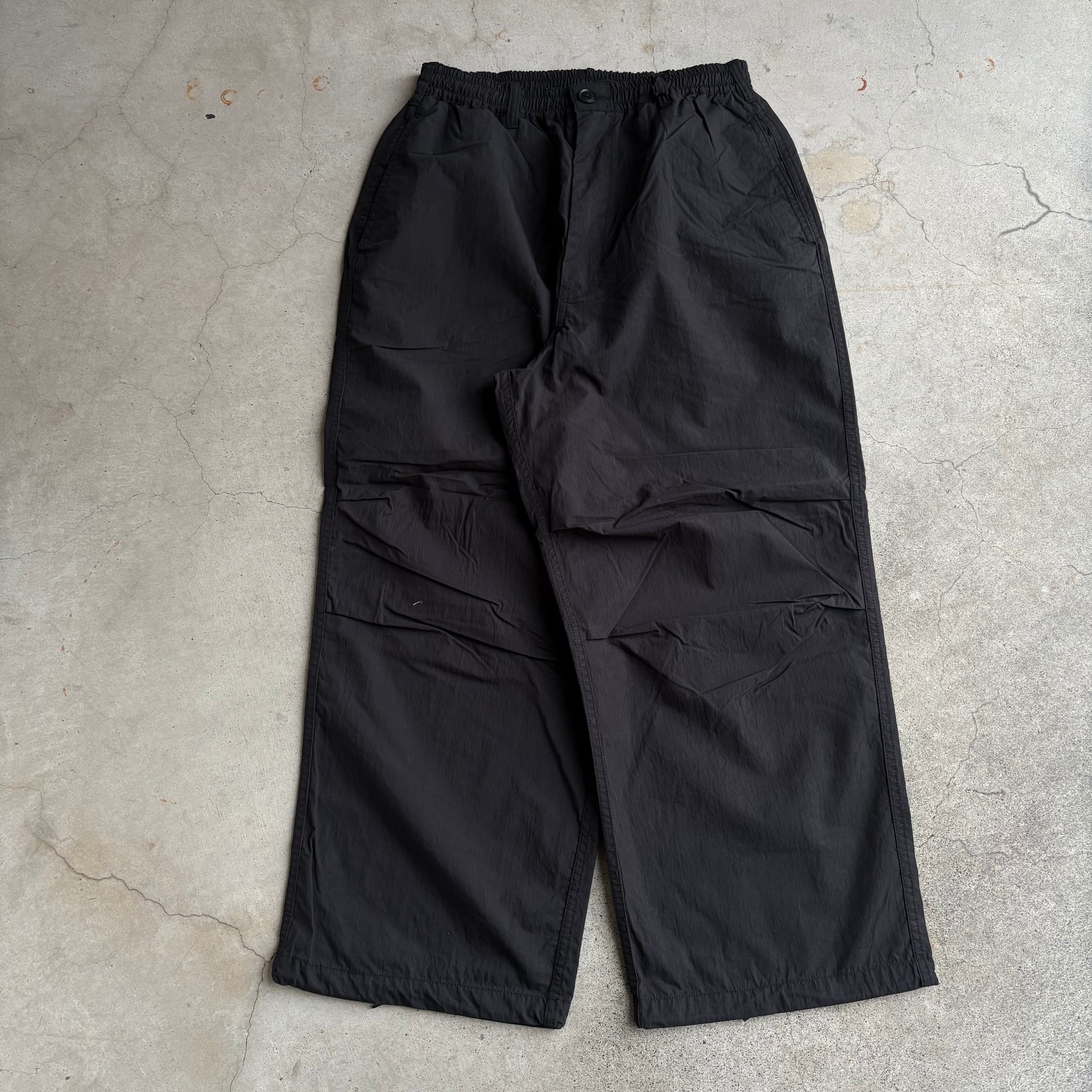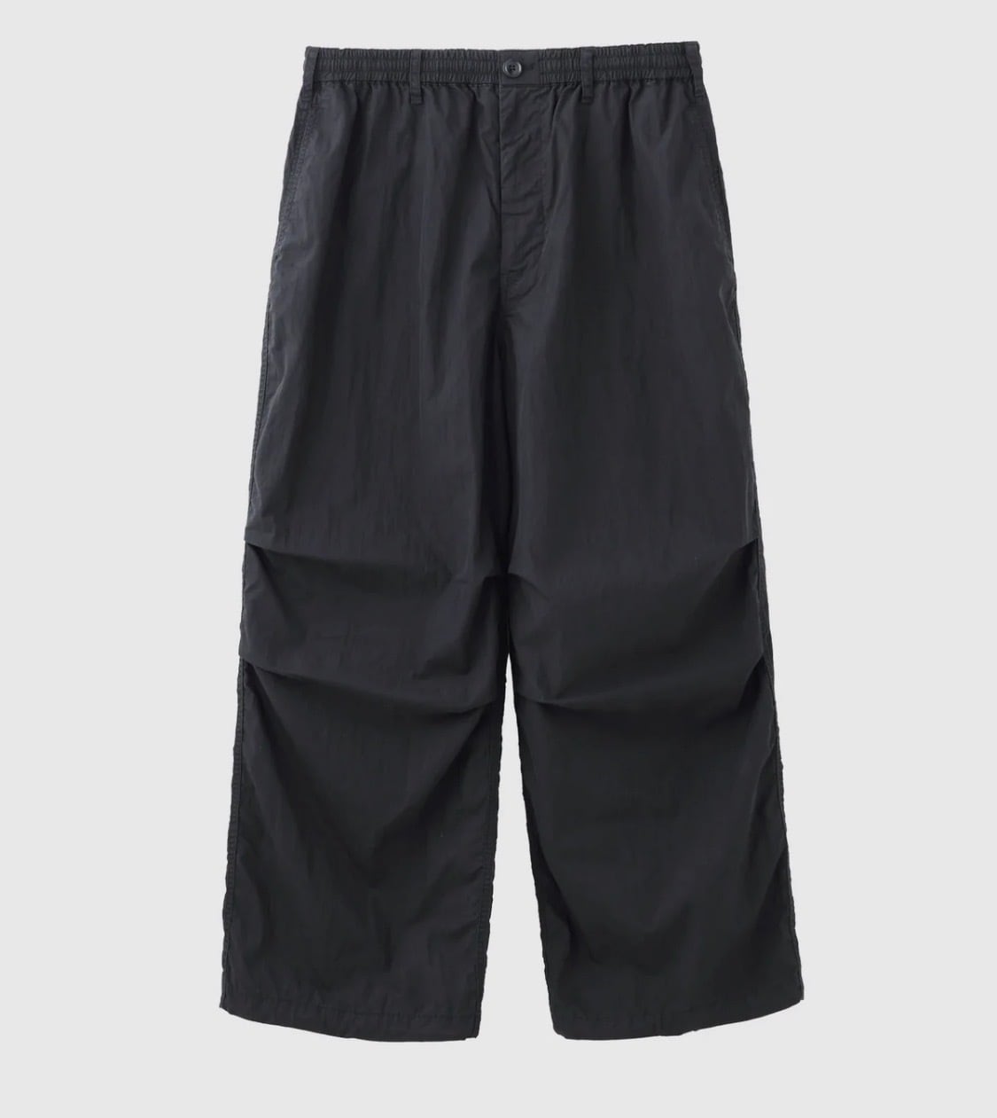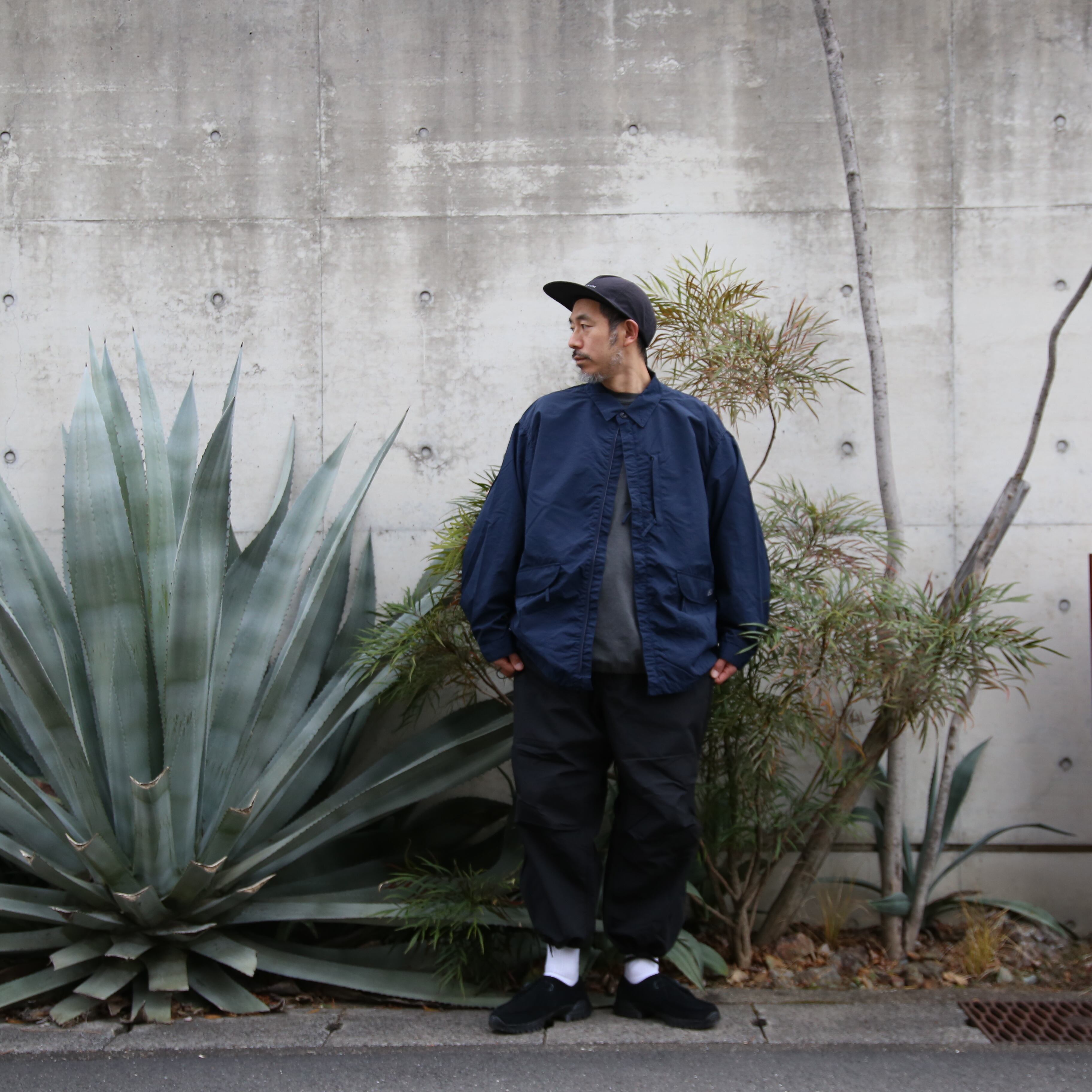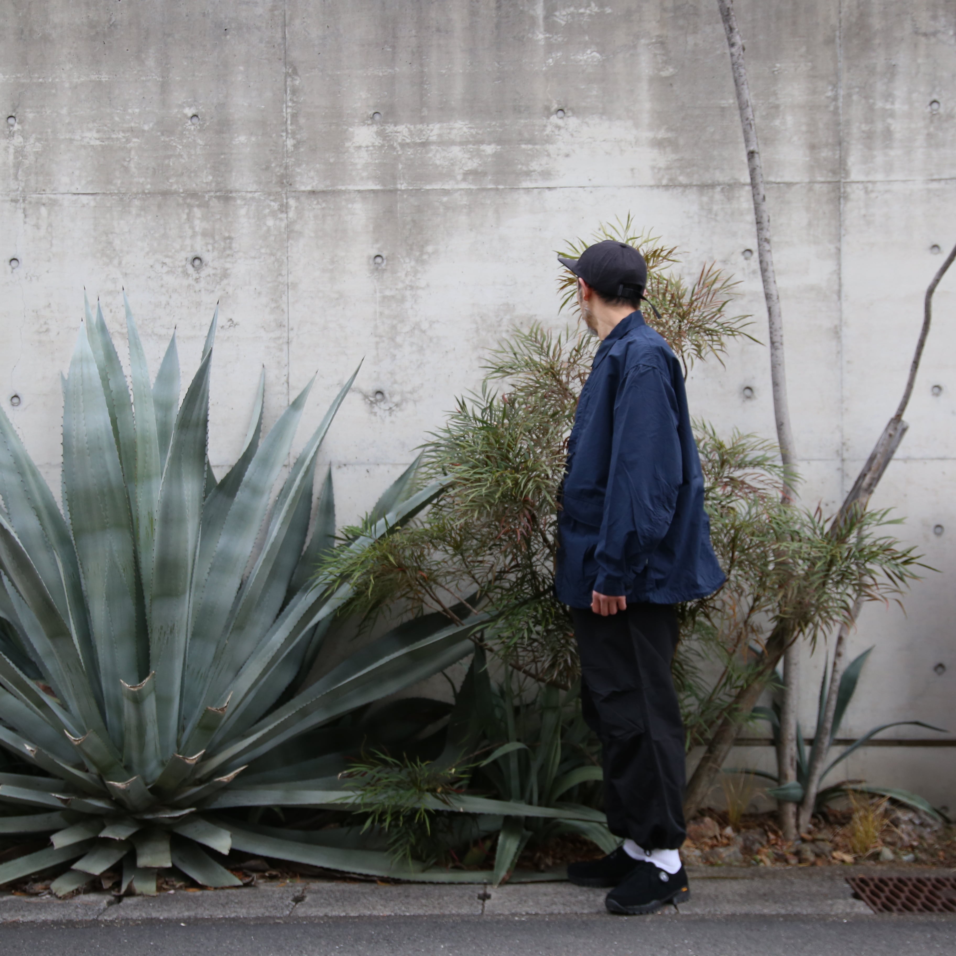 こちらも定番で作っているオーバーパンツをブラッシュアップしました。素材は既出のスタンドカラージャケットと同じ、コットンxナイロンのウォッシュド加工。元々太めのパンツですが、最近大好きな裾幅広めのシルエットに変更。太めとはいえ、コットンxナイロンの生地なので、シャカシャカでもなくバリバリでもない大変履きやすい素材感なのでこれ1本あればかなり重宝すること間違いなしのパンツとなっています。