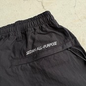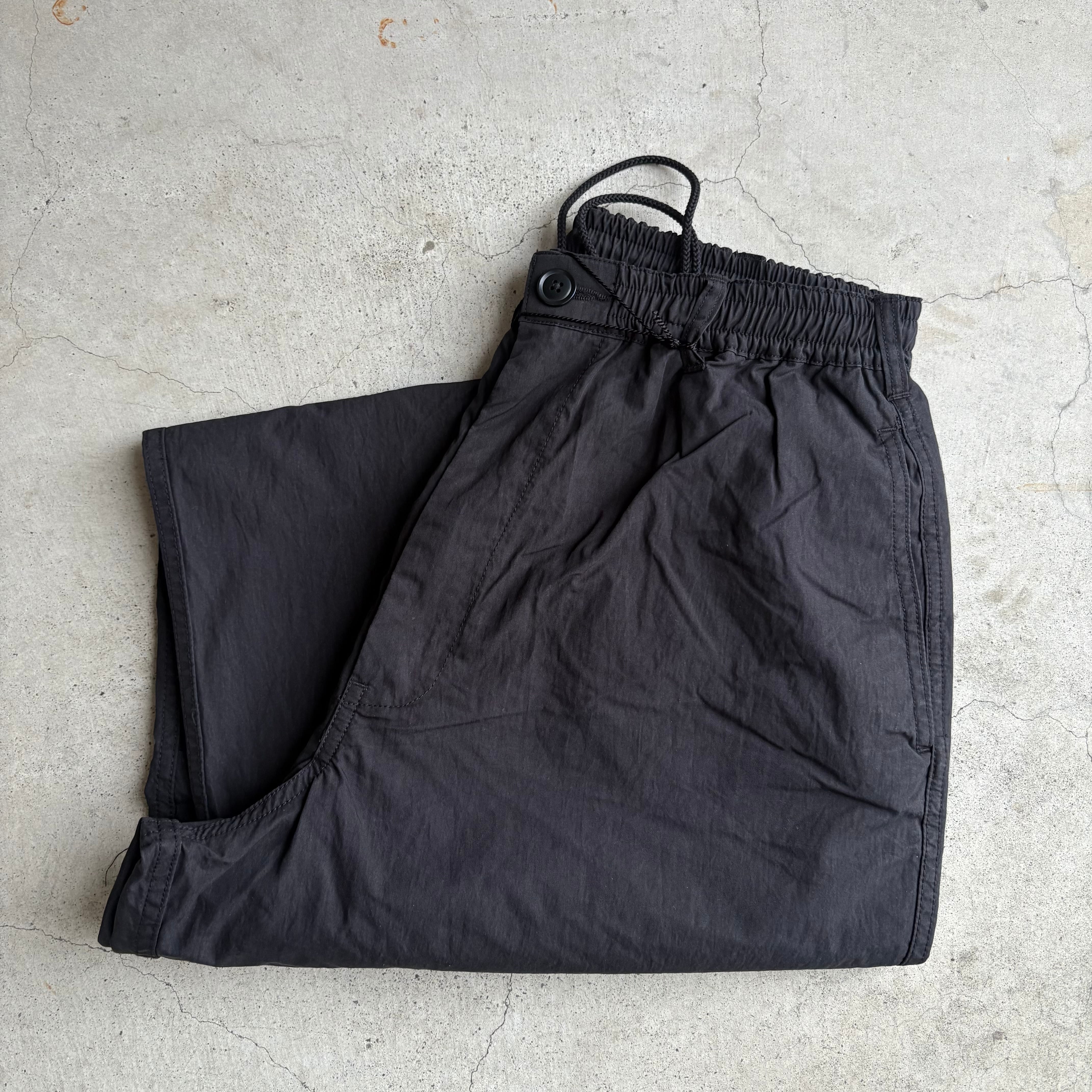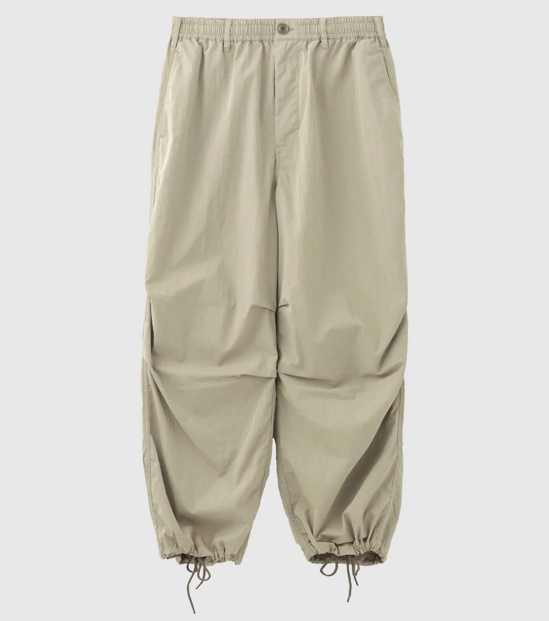 定番で作っているオーバーパンツですが、今年は裾幅を広げてよりワイドフィットに。生地はコットンxナイロンで、製品洗いしているのでシャカシャカでもバリバリでもない雰囲気のある1本に仕上がりました。ウエストはゴム+紐、裾にも紐、バックポケットはファスナー開き。