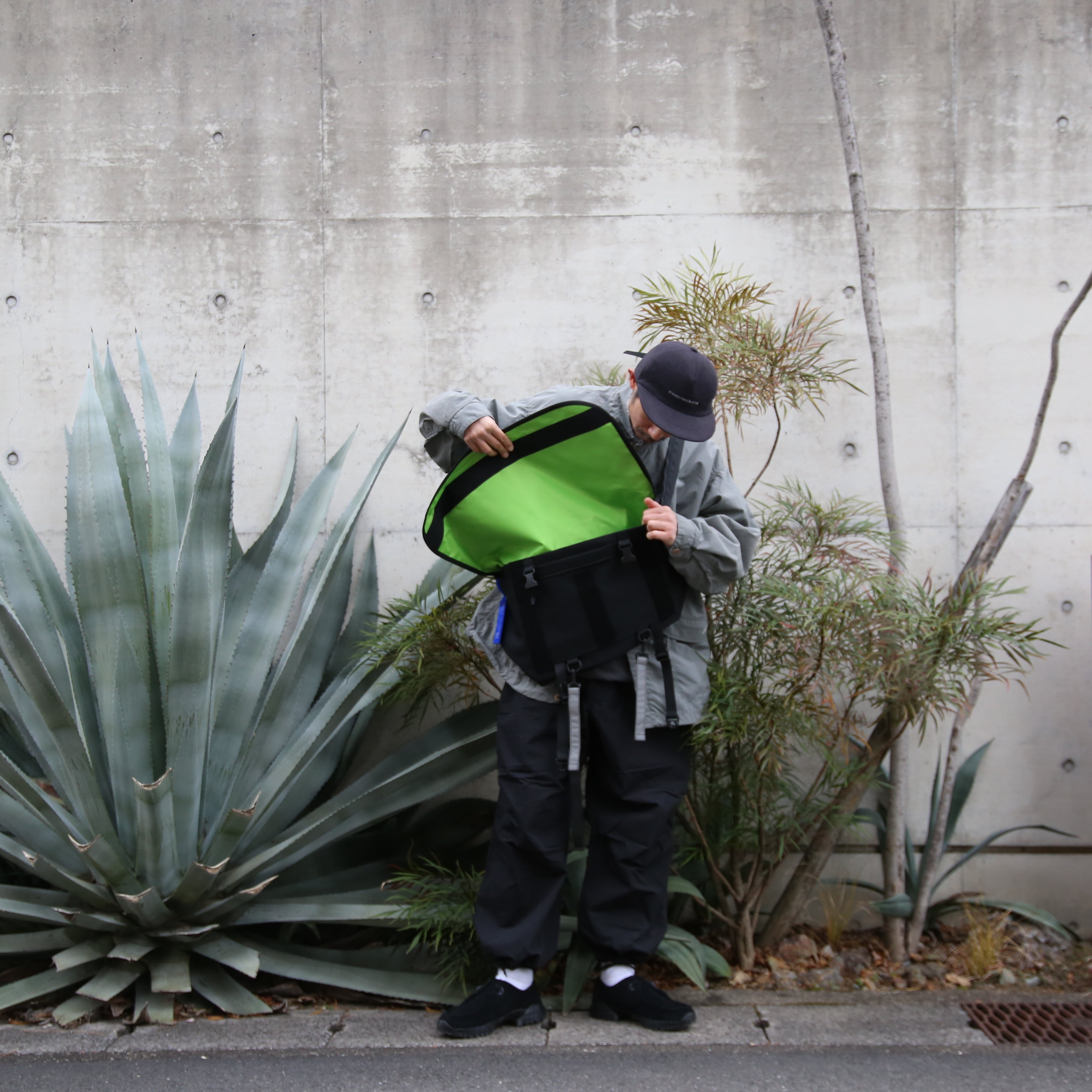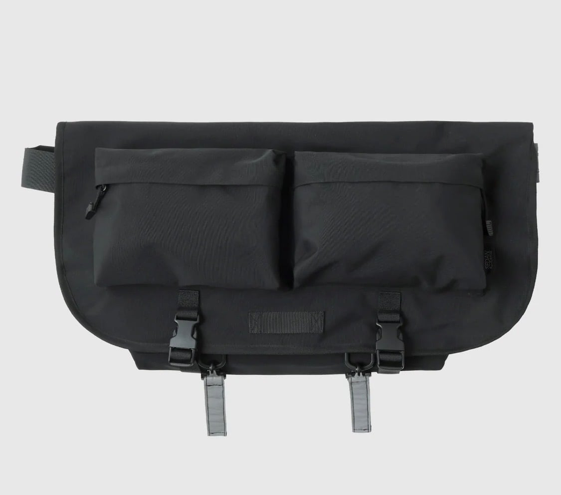 2000年代にピストが流行していた時代に日本でも市民権を得たメッセンジャーバッグ。フィックスという固定ギアで街を走る姿の背中には必ずと言っていいほどそのバッグが使われていました。近年ではもう少しおおらかな意味でそれぞれが自転車文化を楽しんでいるのを横目に感じながら本格的なメッセンジャーバッグのディティールに大好きなバックパックのあのサブポケットを並べてつけてみたら、少しアウトドアも感じられる雰囲気の力の抜けたいいバッグに仕上がりました。背面にはリフレクターも付いて視認性も良く、3点止めでがっちりとホールドできるところも最高です。