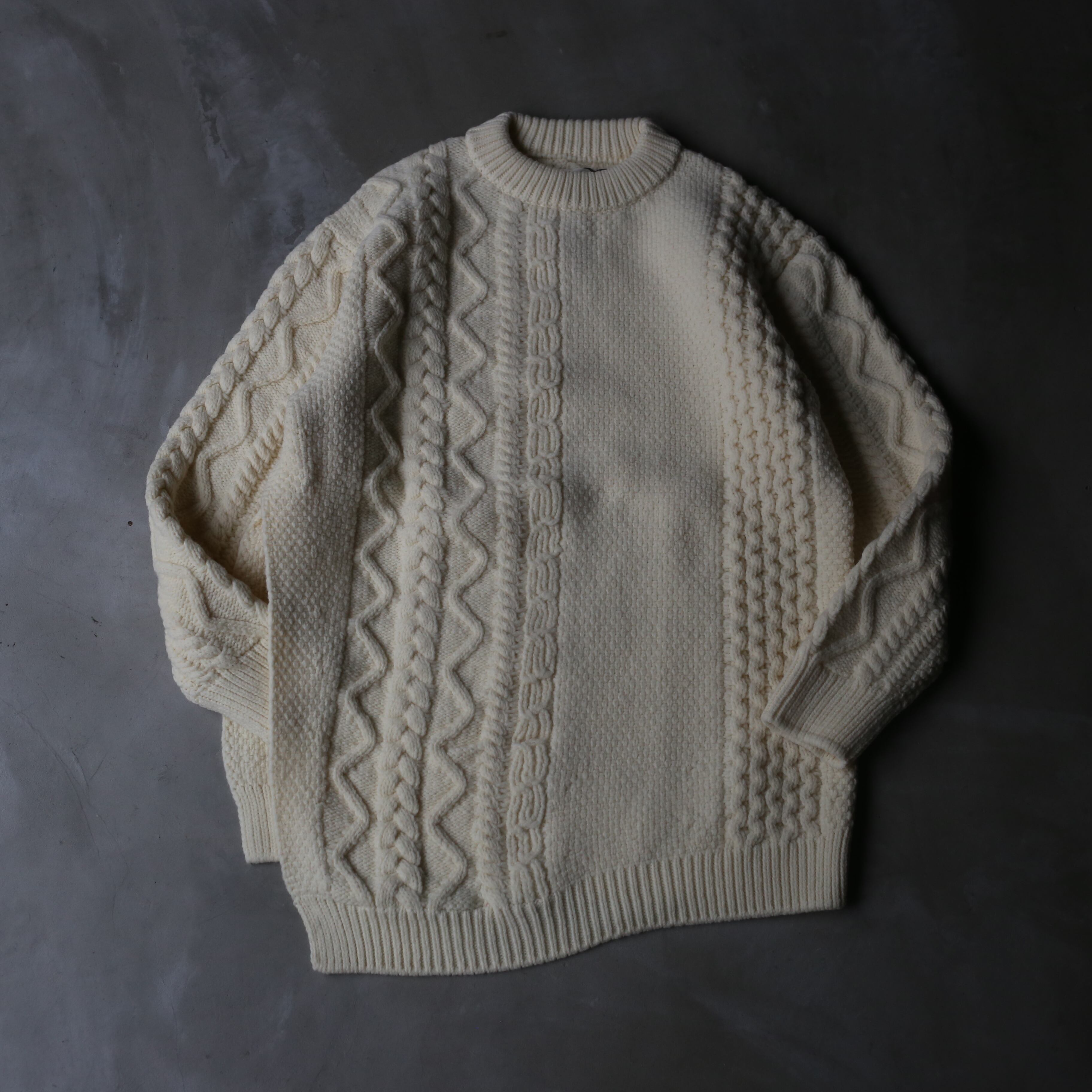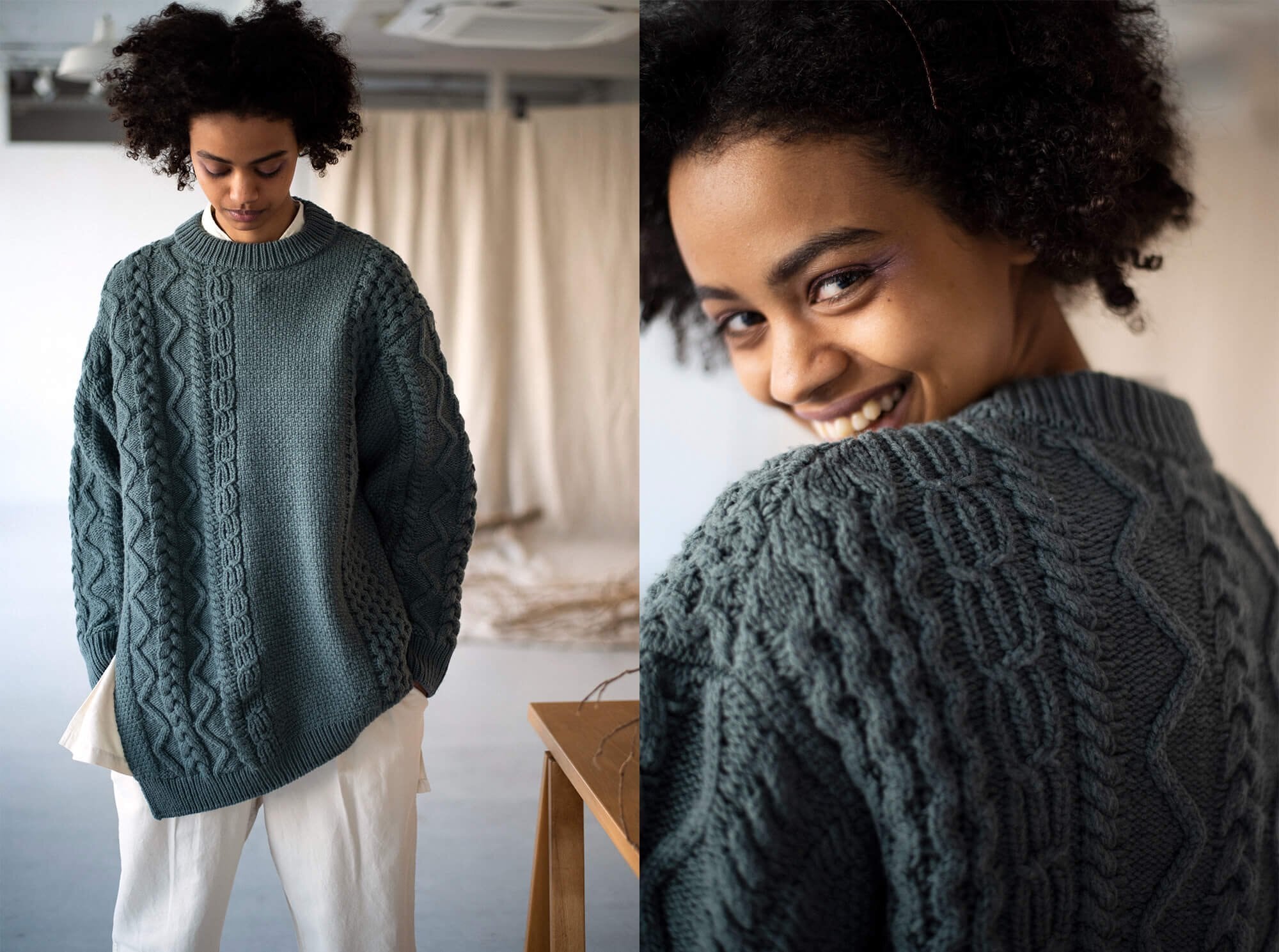メリノ種の原毛を使用したケーブル編みのセーター。