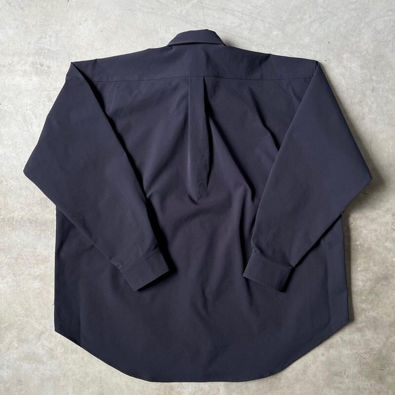 特殊分子構造によりストレッチ性、高耐久性、ソフトタッチを実現した、表情のあるワッシャー加工と撥水加工を施したハイスペック素材を使用したビッグシルエットのシャツ。