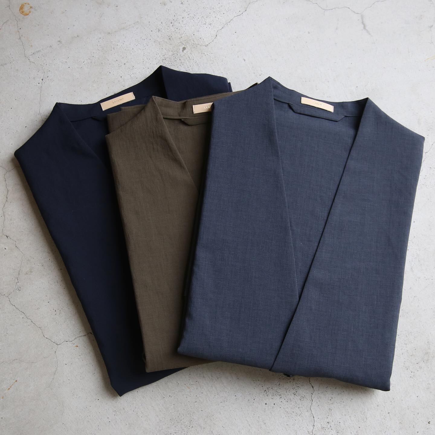少し上品にバンドカラーシャツで合わせるのが