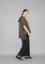 洗い晒しのようなワッシャー感が魅力のコットンリネンタイプライター素材のプルオーバーブラウス。ポンチョのようなワイドフォルムデザインで、両サイドの深いカッティングのスリットとギャザースリーブから続くロングリボンデザインがポイント。袖リボンは蝶結びにせず固結びで垂らすスタイルです。