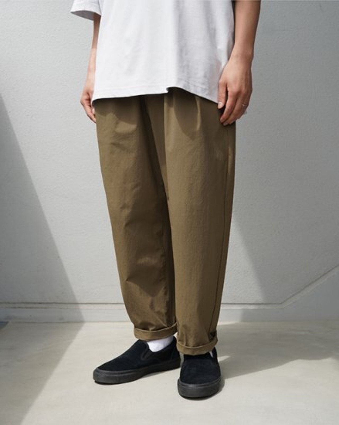 深めに入ったフロントタックが生みだすテーパードシルエットが特徴的なデザイン。