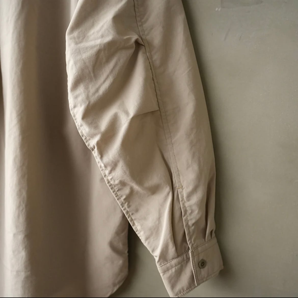 デザインはシンプルなレギュラーカラーシャツですが、 ポケット袋をステッチで押さえた両脇のシームポケット、変形のバックヨークとプリーツ、そしてミリタリーコートのように袖を2枚袖にし、 肘部分にタックを取りボリュームを持たせたディテールが特徴です。