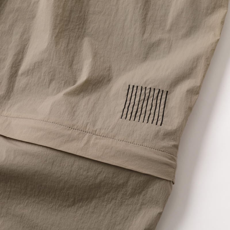 ロングパンツ、ショーツでもどちらもワイドなシルエットを楽しんでいただけます。素材は20Dのナイロンを使った、超軽量・強撥水・ハイストレッチ生地を使用。細い糸を使用しながらも高密度であるため、独特なハリ感・上質な見え方が特徴の素材です。裏地には高多汗処理機能を持ち、肌面を快適に保つメッシュ素材を使用。